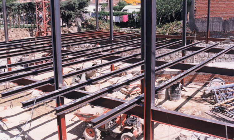 La estructura es de acero con forjados de chapa perfilada minionda, con pórticos rígidos transversales a la fachada. Las vigas de borde en fachada estabilizan el conjunto.
