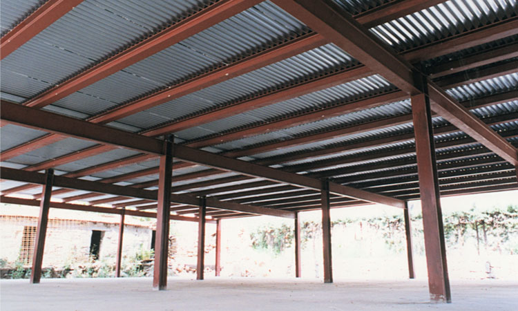 La estructura es de acero con forjados de chapa perfilada minionda, con pórticos rígidos transversales a la fachada. Las vigas de borde en fachada estabilizan el conjunto.