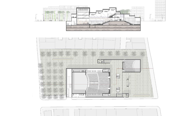 Las dos salas decaladas crean espacios diversos en su perímetro -plazas en la plaza- desde los que se diferencian los accesos al edificio.