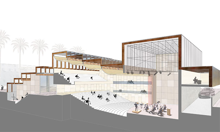 El vestíbulo entre salas resulta plaza cubierta, prolongación de la ciudad hacia los graderíos excavados.