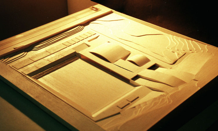 Aprovechando los desniveles existentes -la suave ladera que desciende del Paraninfo- emplazamos el nuevo conjunto a media ladera, formando un conjunto aterrazado que será un mirador hacia el Suroeste de la ciudad. El recinto se cubre con una bóveda de cañón, y la luz del día penetrará por sus tímpanos a través de dos grandes ventanas termales. Un modelo clásico y probado de potente impacto plástico y espacial.