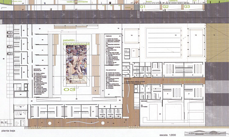 El rasgo mas característico del complejo será la cubierta ajardinada que envuelve el plano principal, tanto el vestíbulo como las pistas.