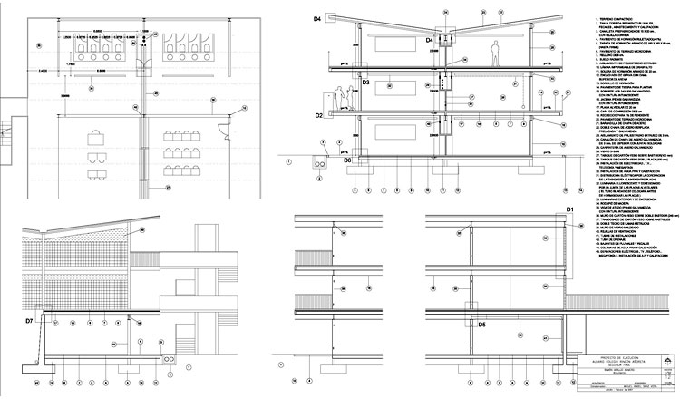 Las aulas tendrán su pared acristalada y la galería en voladizo protege el interior del sol, la lluvia y el viento. Los acristalamientos se emplazan a ejes de pórticos, de modo que la estructura queda vista en las galerías.