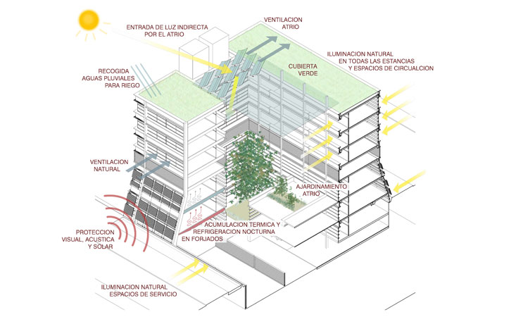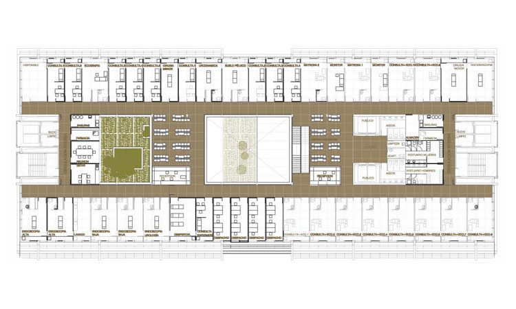 La tipología compacta en torno a un atrio parece una de las soluciones más adecuadas para un centro ambulatorio de gran complejidad, aportando un claro esquema de circulaciones y la iluminación natural de todos los espacios.