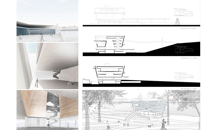Creamos ahora una gran plaza elevada frente al mar, y el edificio es un paseo espiral que asciende desde el puerto y nos lleva al parque en lo alto, creando un juego de niveles que abre el edifico a su entorno y lo atrae como un gigantesco imán.