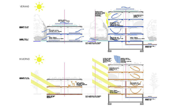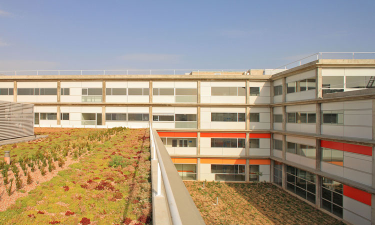 La estrategias de control energético y medioambiental se fundamenta en una serie de decisiones: entorno ajardinado, cubiertas ajardinadas, control solar, ventilación natural y construcción lo más prefabricada posible.