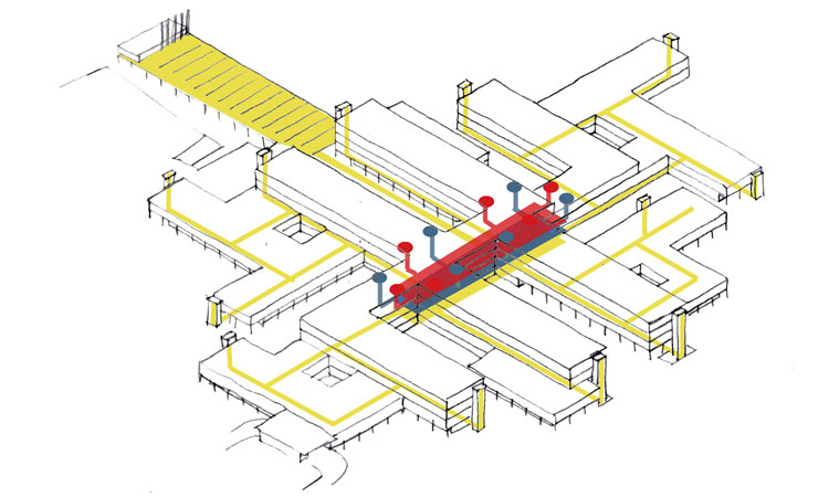 El abastecimiento de energía se realiza desde un edificio independiente desde el que se distribuyen las instalaciones por el techo del muelle de carga hasta enlazar con la espina central del edificio, donde nacen los conductos verticales. Desde este punto se distribuyen las redes por el doble techo. Estos conductos exteriores se prolongan hasta las cubiertas, donde se sitúan las unidades de tratamiento de aire.