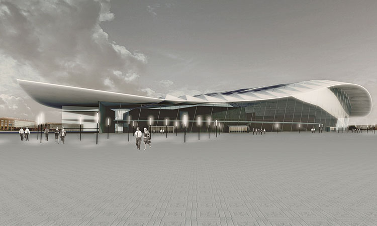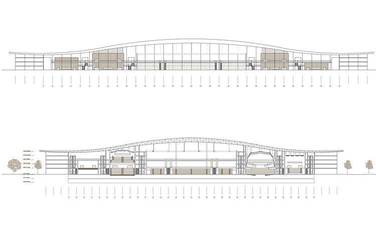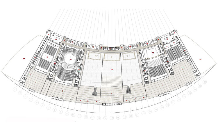 El complejo conjunto de salas se reune bajo una gran cubierta en arco que aporta un claro plan organizador lineal, formando una especie de gran hemiciclo desde el que accedemos a los diferentes espacios colectivos y formando una corona opuesta de servicios, resultando una clara especialización de circulaciones a todos los niveles del edificio.