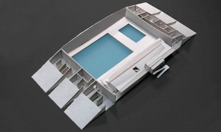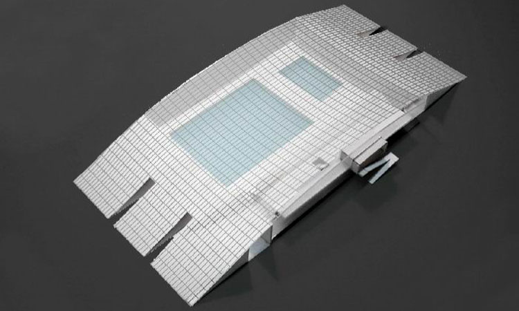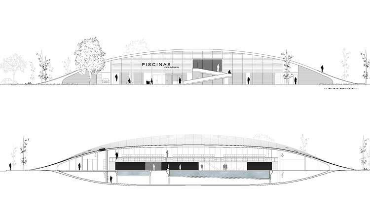En este proyecto, posterior a la bóveda de cañón del polideportivo del Colegio Añoreta, propusimos una cáscara de doble curvatura. El edificio es un gran arco abierto por sus fachadas principales.