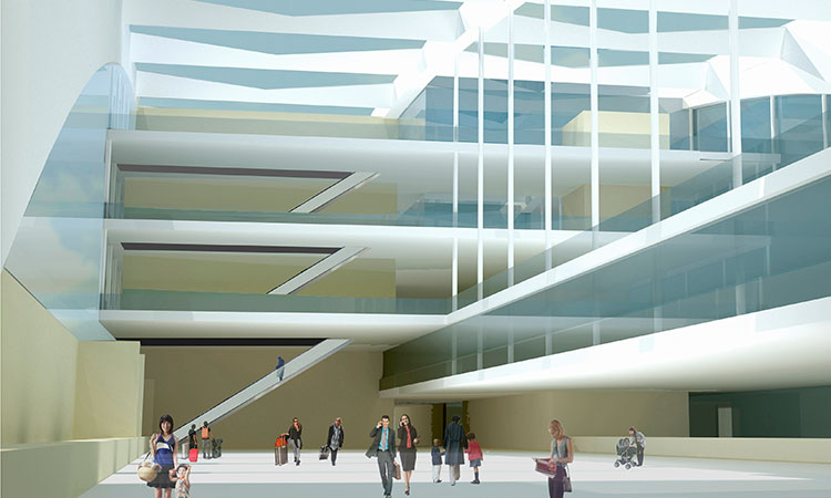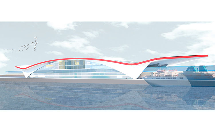 Hemos concebido la nueva terminal como un gran arco, una puerta de entrada al país. Una forma poderosa y sencilla alusiva con sus extremos alados a las formas del lugar. Mientras desde el mar el arco es un símbolo de bienvenida, del lado de tierra se produce un gran voladizo que forma una plaza pública. Un mirador abierto sobre el mar.