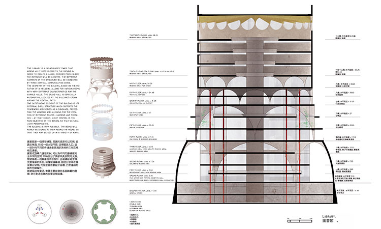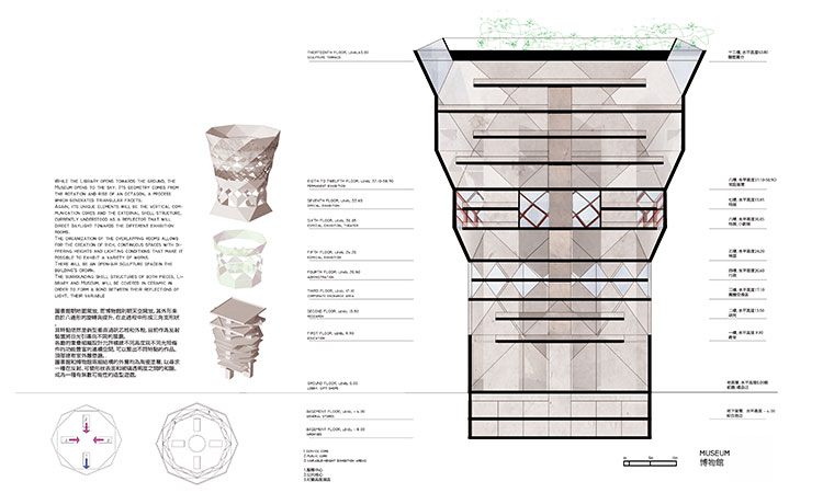 La Biblioteca es una torre de base circular basada en el giro de un hexágono. El Museo se abre hacia el cielo y su geometría deriva del giro y ascenso de un octógono.